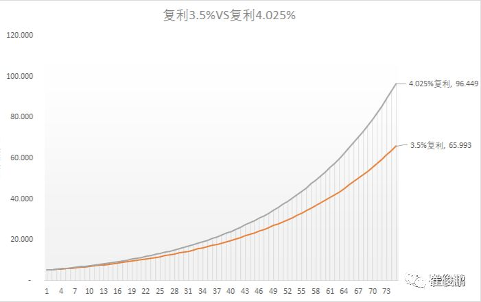 4.025%消失之后剩下的可能只有3.5%(即去除掉上浮15%部分后的计算结果),为了更直观地表示两者之间的差距,我们做一个简单的比较,期初本金都是5万,从下图中我们可以很明显的看出两者之间收益的差距在逐年增大,到75年末时,差距达到30万之巨。一笔不算大的金额能查如此之多的金额,那如果资金规模更大一些呢?